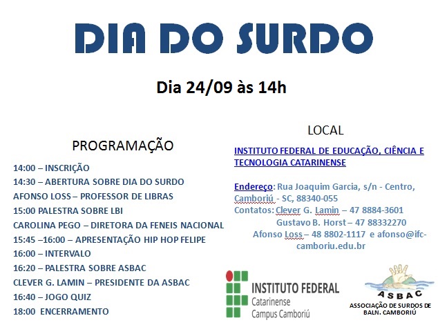 dia-do-surdoNo dia 24/09, a partir das 14h, o Instituto Federal Catarinense (IFC) – Campus Camboriú, em parceria com a Associação de Surdos de Balneário Camboriú (ASBAC), realiza um evento em comemoração ao Dia do Surdo.
