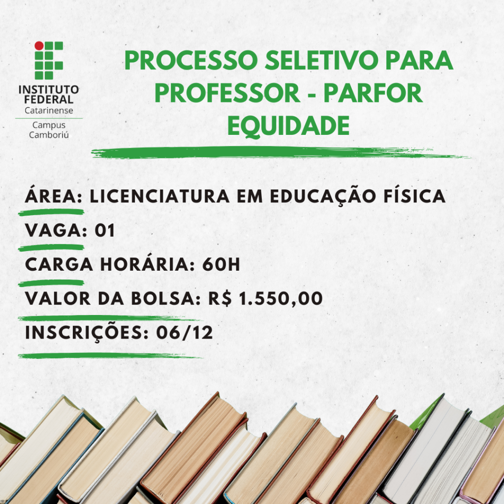 Estão abertas as inscrições, até 06/12, para o processo seletivo simplificado para professor formador para atuar no Programa Nacional de Fomento à Equidade na Formação de Professores da Educação Básica (PARFOR EQUIDADE), como bolsista da Coordenação de Aperfeiçoamento de Pessoal de Nível Superior (CAPES). Para participar, é necessário pertencer, preferencialmente, ao quadro de servidores do IFC.