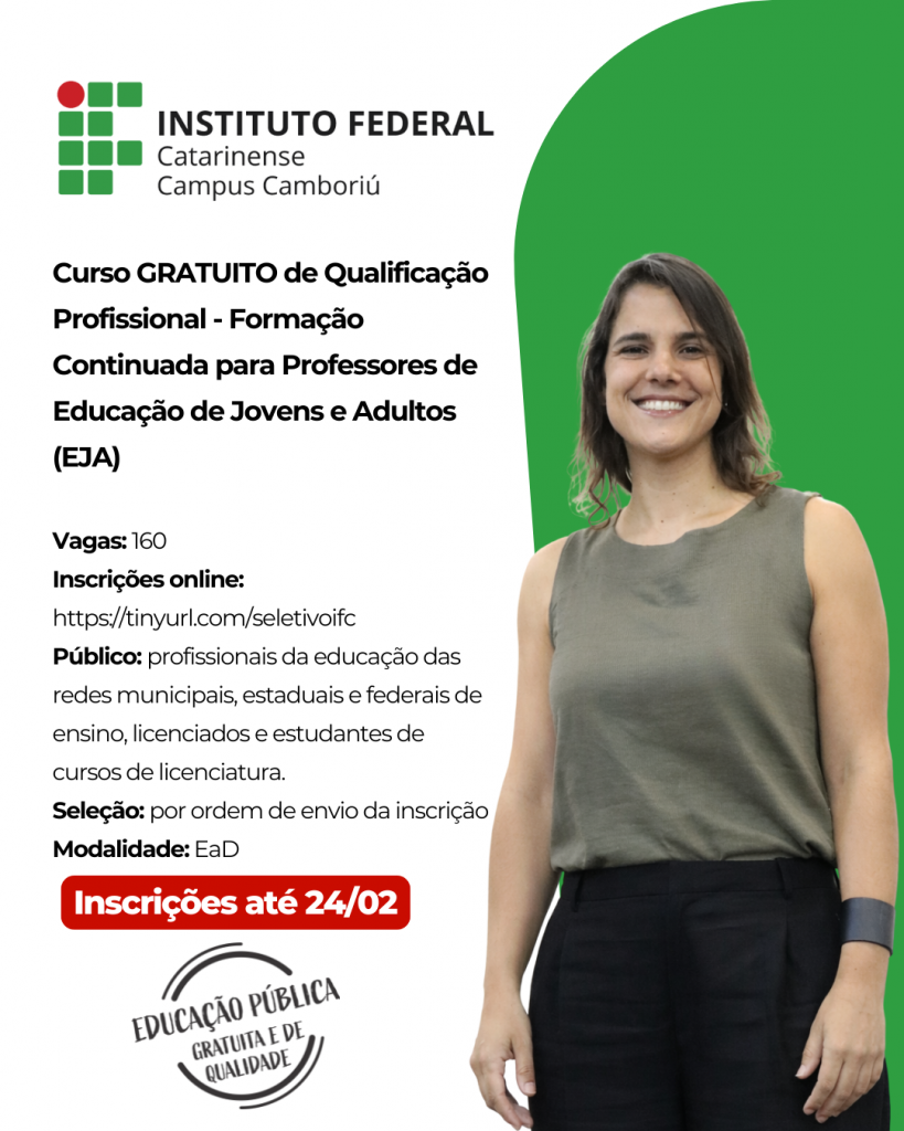 O Instituto Federal Catarinense (IFC) – Campus Camboriú está com inscrições abertas, até 24/02, para o curso de Qualificação Profissional – Formação continuada para professores de Educação de Jovens e Adultos (EJA). A formação é gratuita, ofertada na modalidade a distância (EaD), e conta com 160 vagas destinada aos profissionais da Educação das redes municipais, estaduais e federais de ensino, licenciados e estudantes de cursos de licenciatura.