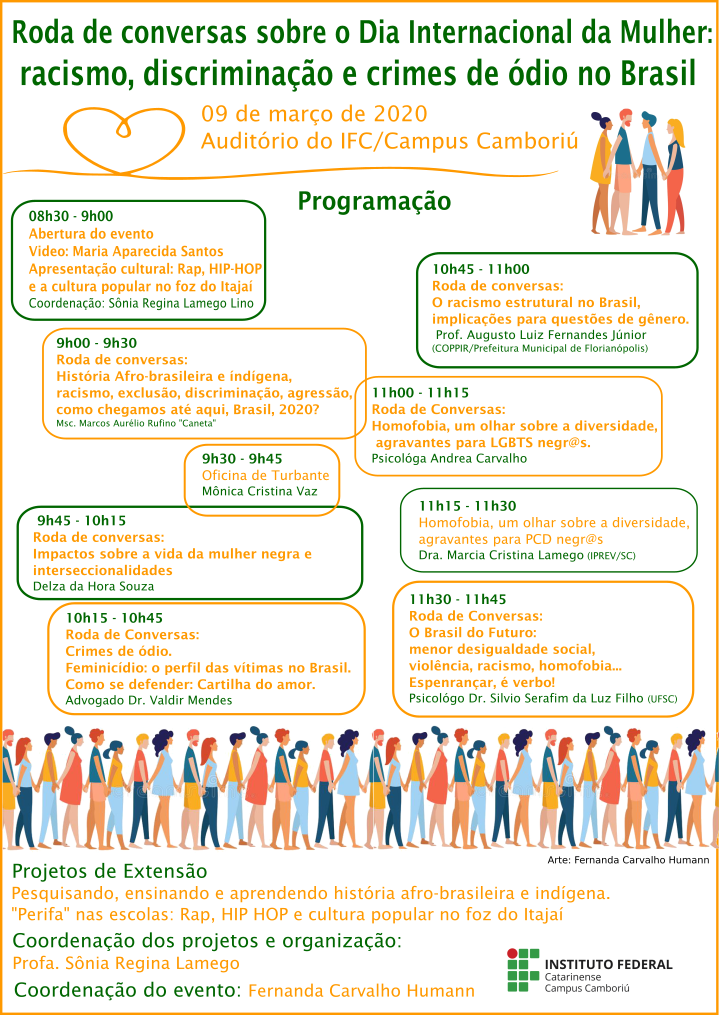 Para marcar o dia “Dia internacional da mulher”, na segunda-feira, 09/03, das 8h30 às 11h45, o auditório do Instituto Federal Catarinense (IFC) – Campus Camboriú recebe a roda de conversa intitulada: “Dia internacional da Mulher: racismo, discriminação e crimes de ódio no Brasil”. O evento faz parte do cronograma de encerramento dos projetos de extensão: “Pesquisando, ensinando e aprendendo história afro-brasileira e indígena” e “Perifa nas escolas: RAP, HIP-HOP e a cultura popular na Foz do Itajaí”, coordenados pela professora do campus, Sônia Regina Lamego Lino.