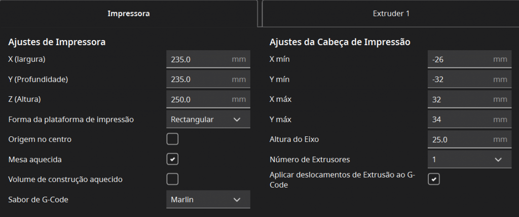 Configuração da Impressora no UltiMaker Cura: