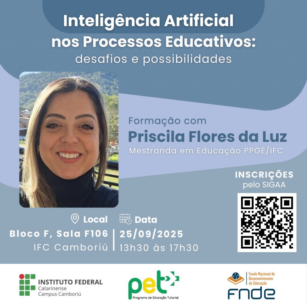 Estão abertas as inscrições para o curso “Inteligência artificial nos processos educativos: desafios e possibilidades”, com a mestranda em Educação do PPGE-IFC, Priscila Flores da Luz. A capacitação será ministrada no dia 25/09, das 13h30 às 17h30, na Sala F 106, no Instituto Federal Catarinense (IFC) – Campus Camboriú.