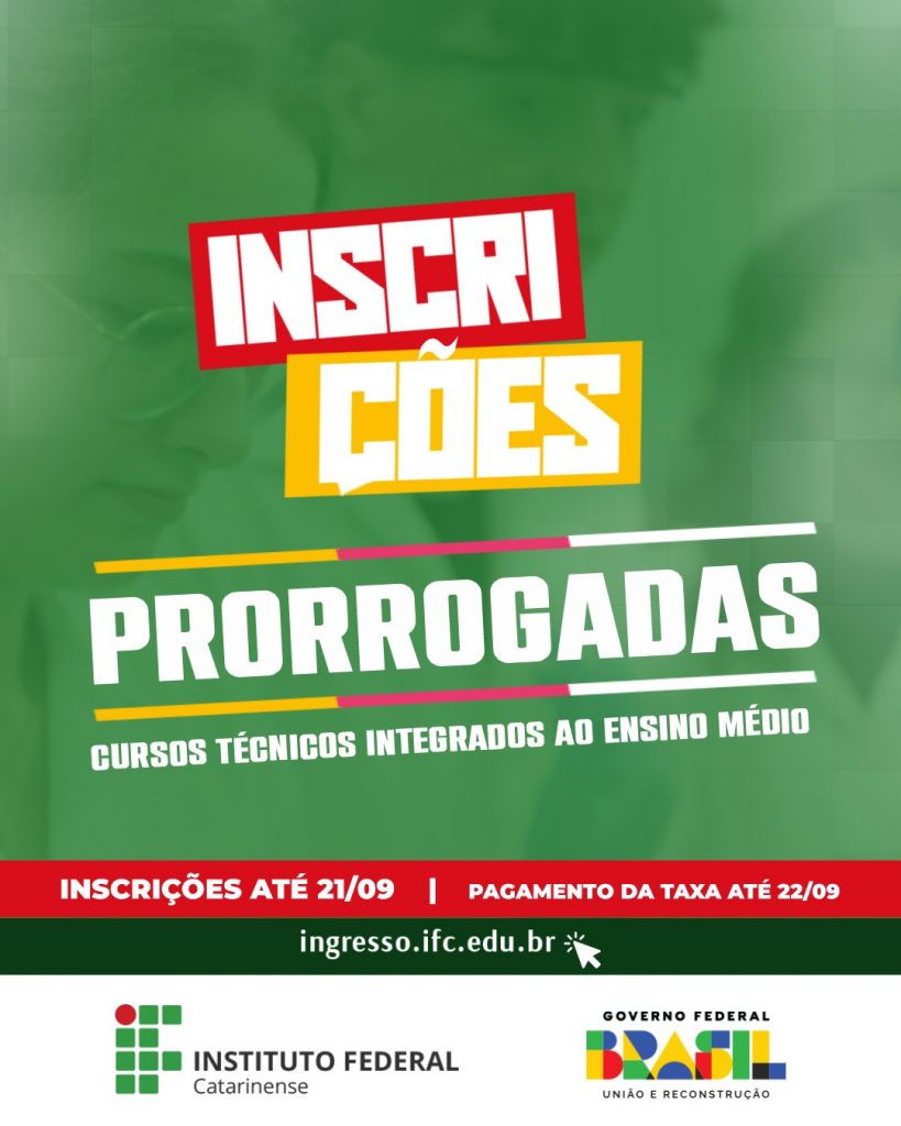 O período de inscrições para o processo seletivo foi PRORROGADO até o dia 21 de setembro. A taxa de inscrição é de R$ 30. O procedimento é feito totalmente pela internet, por meio do Portal do Candidato do IFC; para fazer o login, é necessário ter uma conta na plataforma GOV.BR, do Governo Federal. Para quem não tiver acesso à rede, a Coordenação Geral de Ensino do IFC Camboriú vai disponibilizar computadores para inscrição, nos seguintes horários: das 8h às 11h e das 14h às 18h30, de segunda a sexta-feira.
