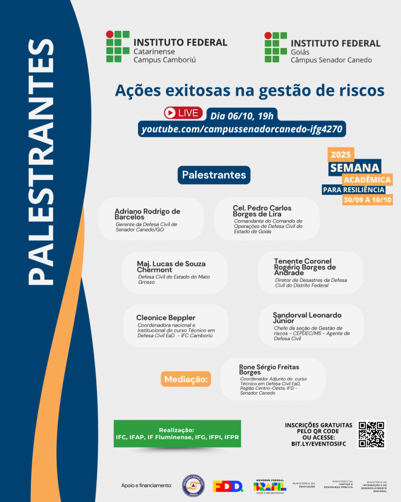 O Instituto Federal Catarinense de Goiás (IFG) – Campus Senador Canedo, em parceria com o IFC Camboriú, promove a palestra online sobre o tema “Ações exitosas na gestão de riscos”, no dia 06/10, 19h. O evento será transmitido no canal do IFG Senador Canedo no Youtube.