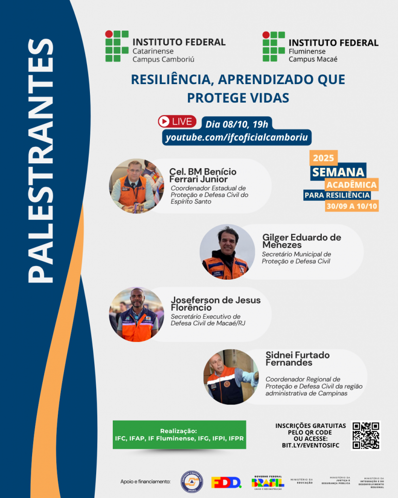Como parte da Semana Acadêmica para Resiliência 2025, o Instituto Federal Fluminense (IFF) – Campus Macaé, em parceria com o Instituto Federal Catarinense (IFC) – Camboriú, promove a live “Resiliência, aprendizado que protege vidas”, que será transmitida no dia 08/10, às 19h, pelo canal youtube.com/ifcoficialcamboriu