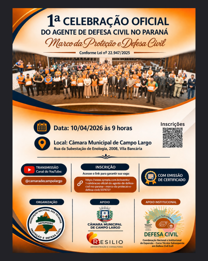 Inscrições gratuitas: https://www.sympla.com.br/evento/1-celebracao-oficial-do-agente-de-defesa-civil-no-parana-marco-da-protecao-e-defesa-civil/3374727