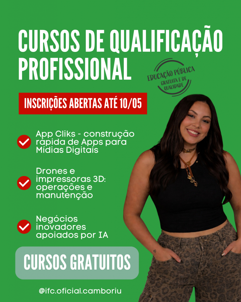 O Instituto Federal Catarinense (IFC) – Campus Camboriú está com inscrições abertas, até o dia 10/05, para cursos gratuitos de qualificação profissional. Ao todo, são ofertadas 75 vagas distribuídas em três cursos nas áreas de tecnologia, inovação e empreendedorismo, com aulas presenciais no campus e carga horária de 200 horas.